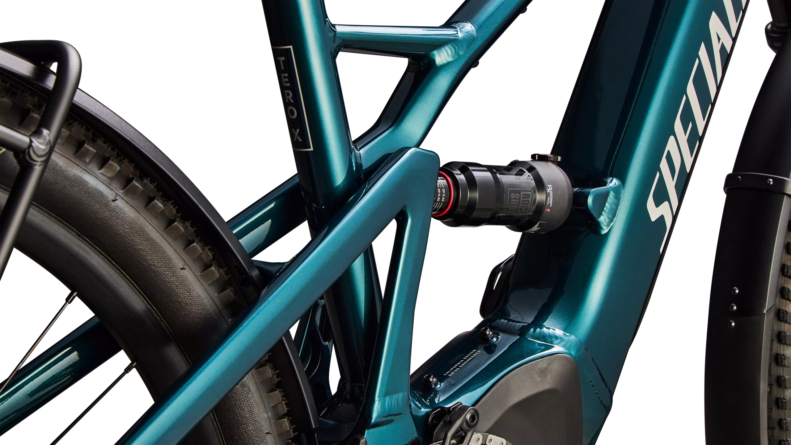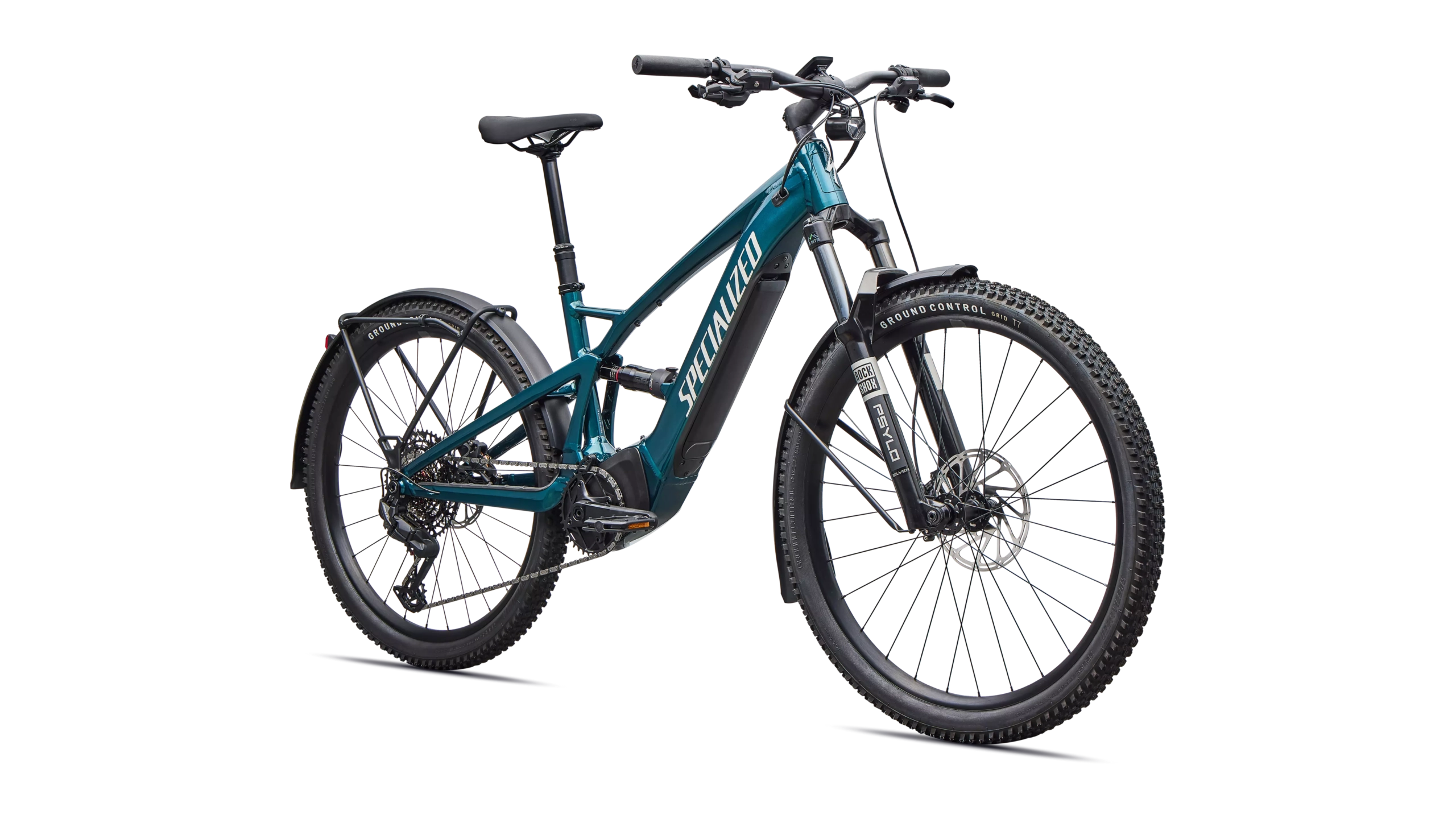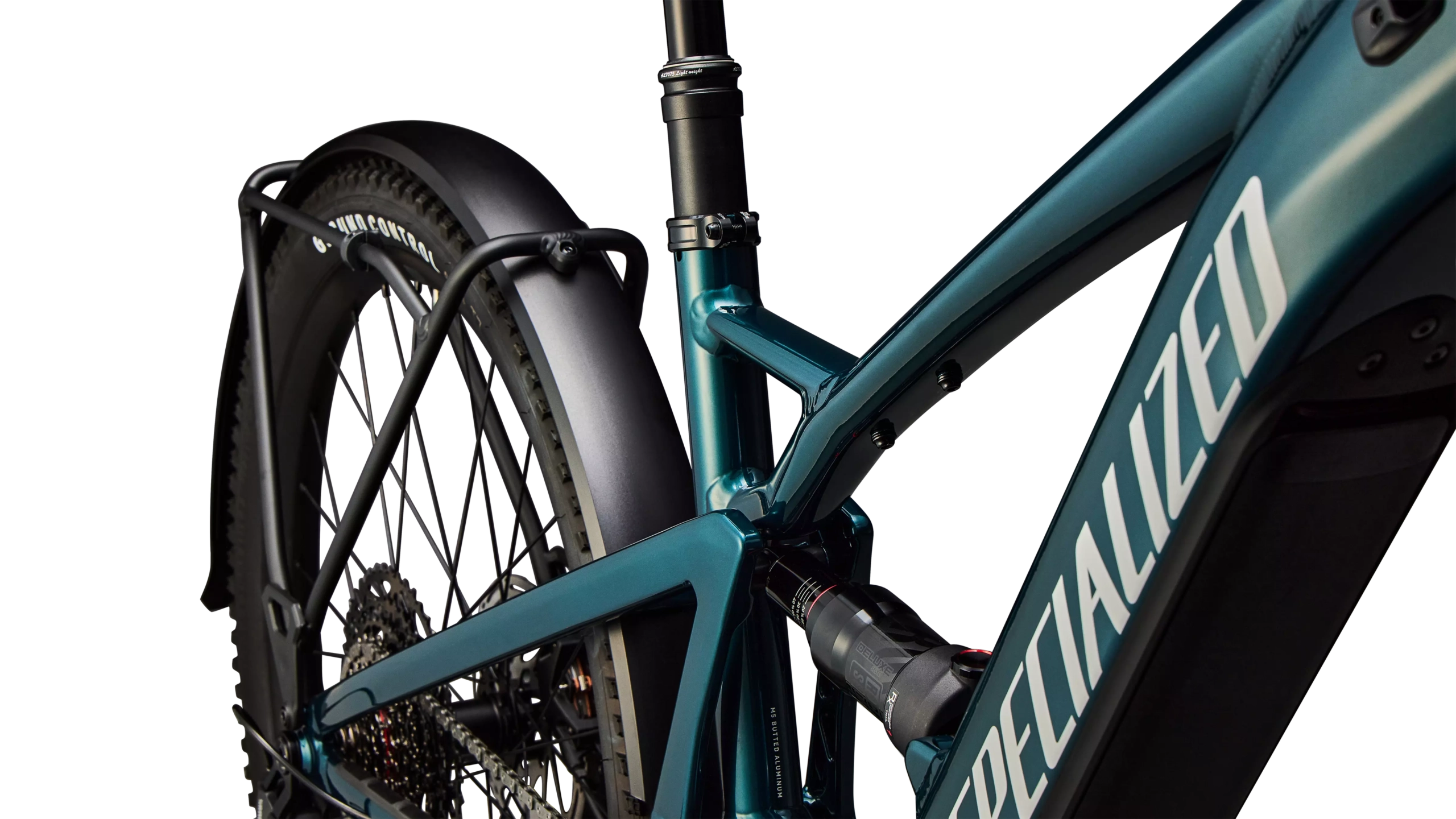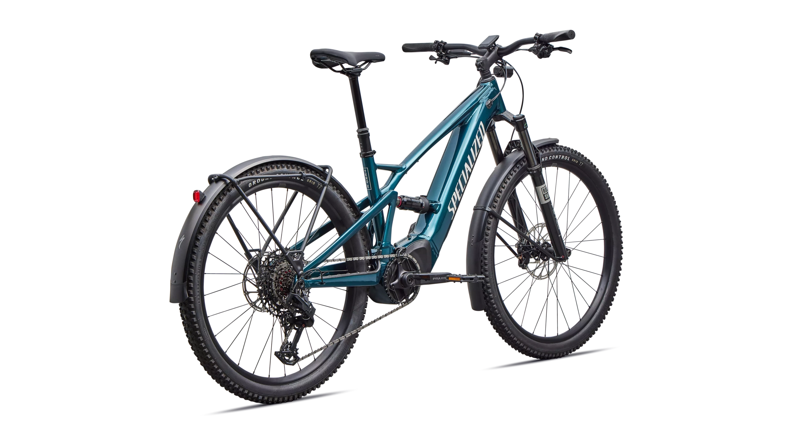E5 Aluminum, full suspension, mullet style for M-XL, bottom bracket motor mount, fully integrated & lockable downtube battery, internal cable routing, lock and front rack mount